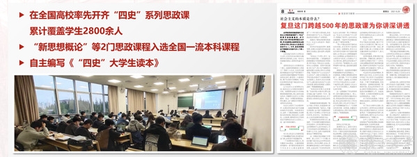 2021年,在学校党委系统谋划和马克思主义学院积极部署下,复旦大学在全国高校率先开齐“四史”系列思政课,累计覆盖学生2800余人。以系列“思政金课”为代表,党史学习教育开展以来,学校继续抓住课堂育人“主渠道”,绘就从“思政课程”到“课程思政”的育人同心圆。