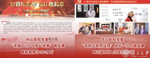 《“四史”大家讲》《解码百年大党》《以史为鉴 开创未来》等多个系列视频微党课100多集,总点击量超过5000万人次;“党史故事我来讲,红色精神我来传”新媒体微党课展评中,各院系学生党支部、党章学习小组拍摄174个微党课视频;中山医院党委“党旗下100个成长故事”微党课,跟帖量累计980多万;华山医院党委“党的光辉照征程”班后一小时微党课,吸引超1万人次在线学习……这一年,党课既有“面对面”的交流,也突破时空的隔阻实现“线连线”的传播;既有领导干部、名师大家的主讲,也激发起广大党员和普通师生的热情。