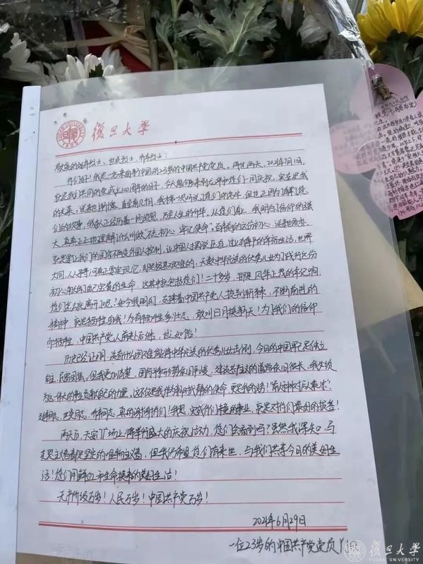 中国共产党百年华诞的前夕,在上海龙华烈士陵园墓前,一位来自复旦的青年共产党员给安葬在此的陈延年、赵世炎、陈乔年等烈士留下了一封手写信。
