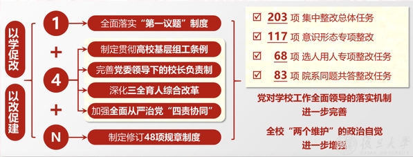 以学习教育促整改,着力构建“1+4+N”制度体系,党对学校工作全面领导的落实机制进一步完善,全校“两个维护”的政治自觉进一步增强。