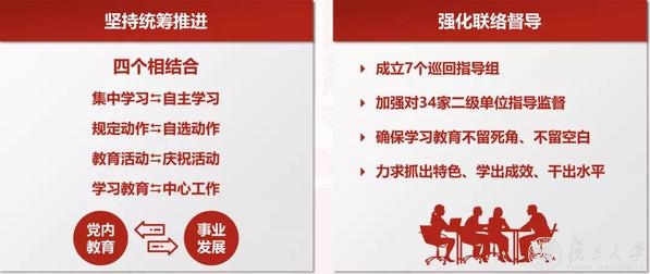 “1+13”个工作方案确保规定动作手势清、自选工作方向明;“三个阶段”周密布置、有序安排,“三线联动”压实责任、扎实推进;集中学习与自主学习、规定动作和自选动作、教育活动与庆祝活动、学习教育与中心工作“四个相结合”,推动党内教育与事业发展深度融合;7个巡回指导组加强对34家二级单位的指导监督,确保学习教育不留死角、不留空白……