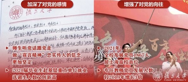 2021年全校发展党员居上海高校首位,专任教师党员发展人数较2019年增长3倍;2021届毕业生赴基层重点单位就业、选调生人数又创新高……在党史学习教育中,复旦人理想信念更坚定,走中国特色社会主义道路的信心决心更坚定;青年学子做“宣言精神”忠实传人、成长为堪当民族复兴大任时代新人的志向更坚定,一句“请党放心,强国有我”道出心声。