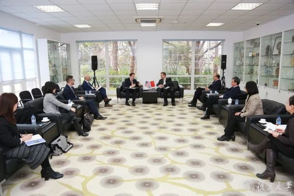 2月18日下午,美国驻上海总领事何乐进(James Heller)率文化领事胡丹尼(Den Hoopingarner)、政治领事戴杰森(Jack Dart)等一行访问复旦大学。校长金力会见了何乐进一行,副校长陈志敏、美国研究中心主任吴心伯、国际合作与交流处处长卢丽安陪同会见。