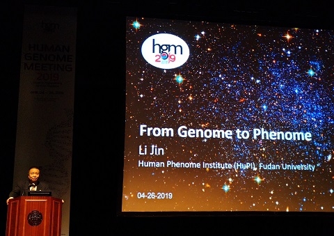 2019年4月26日,在韩国首尔召开的国际人类基因组大会(Human Genome Meeting,HGM 2019)上,复旦大学副校长、人类表型组研究院院长、遗传工程国家重点实验室PI、生命科学学院教授金力院士荣获由国际人类基因组组织(Human Genome Organisation,HUGO)颁发的卓越科学成就奖。会议期间,金力院士受邀作了题为“从基因组到表型组”的大会特邀报告。他指出,在人类基因组计划取得历史性成就之后,实施人类表型组计划将开启生物医学研究新范式。通过精确绘制人类表型组导航图(A Navigation Map for Human Phenome),将推动人类基因组密码与表型组特征的完美对接,为共生共享的 “人类健康共同体”愿景奠定坚实的科学基础。