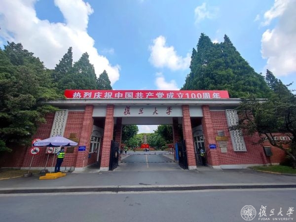 7月1日的复旦大学,在灿烂阳光下闪耀红色光芒。