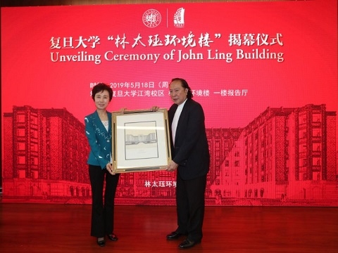 5月18日上午,“林太珏环境楼”揭幕仪式在复旦大学江湾校区举行。仪式上,华侨林太珏家属向复旦大学捐赠八千万元,用于支持复旦大学教育事业发展。