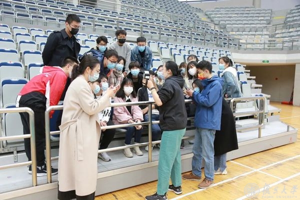 在正大体育馆,校内志愿者们有序进行核酸检测前的统一培训,学习核酸采集PDA手持终端使用方法、信息录入注意事项以及志愿者防疫要求。