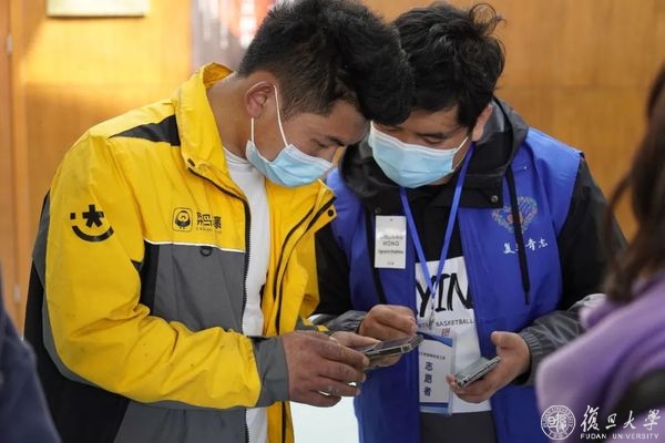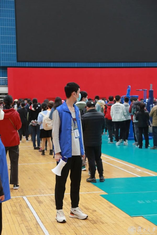 “请大家打开健康云二维码,按顺序排好队伍。” 准备就绪后,志愿者们到达岗位,准时展开服务。来自32个院系及医学院的 312 位志愿者参与了四大校区12个点位的志愿服务。