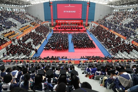 骊歌唱响,青春远航。“团结、服务、牺牲,师生一德精神贯”“爱国、求实、创新,先忧后乐交相勉”“志存高远、脚踏实地,与祖国同行”“勤奋学习、勇于创新,与时代同行”“拥抱新时代,奋进新时代,让青春在奉献中焕发光彩”,正大体育馆主席台两侧和会场四周悬挂着的红色横幅烘托出了毕业的气氛和庄重的仪式感。