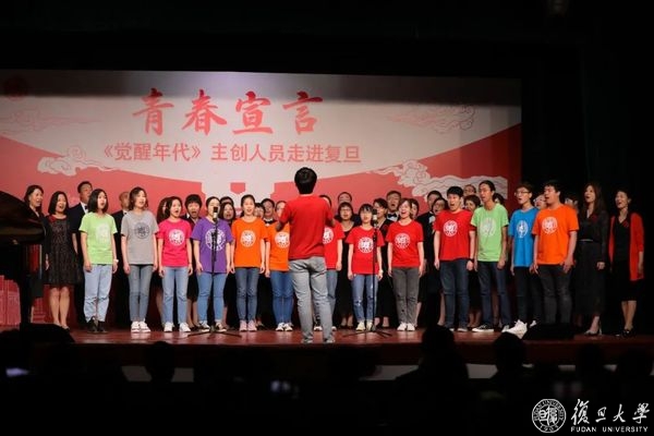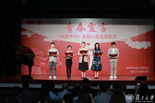 随后,复旦大师剧中陈望道的饰演者、国务学院学生范涛溢,青年谢希德的饰演者、护理学院学生陈玺竹,老年谢希德的饰演者、计算机学院教师王秦,与《觉醒年代》青年演员一起带来散文朗诵——《青春宣言》。