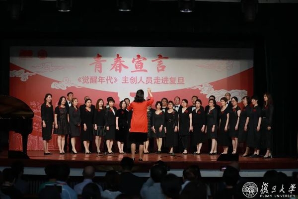 活动最后,复旦大学新闻学院新韵合唱团,复旦大学校友会蓝精灵合唱团演唱《我和我的祖国》以及复旦大学校歌,用歌唱的方式庆祝建党百年。复旦师生代表与主创团队互赠礼品并与全场观众合影留念。