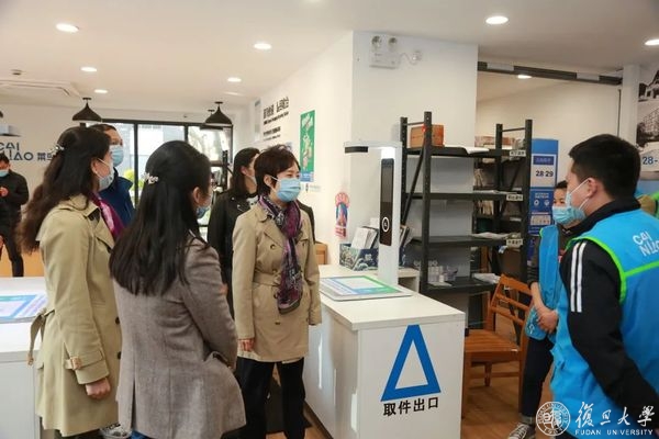 在本部菜鸟驿站,焦扬一行察看快递站服务情况,听取相关负责人对快递转运、消杀、领取等工作流程的介绍,并向为维护校园干净平稳运行的工作人员表示感谢。