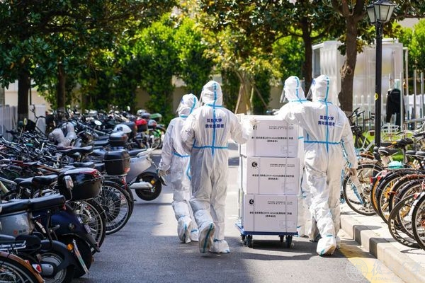 白天的南区,“大白”与“蓝马甲”肩并肩送餐、送物资、送抗原检测试剂盒,守护每个楼栋、楼层,为校园平稳有序运行贡献青春力量。