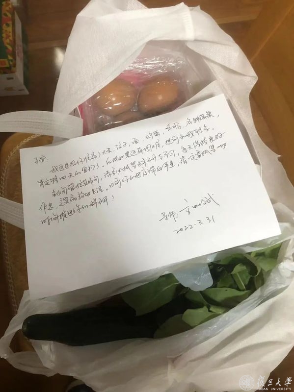 最终,从导师着手准备物资,到博士师兄将物资无接触地送到张同学手上,前后仅用时半小时左右。此外,方虹斌还给张同学手写了一封信,作为居家封闭期间的精神鼓励。