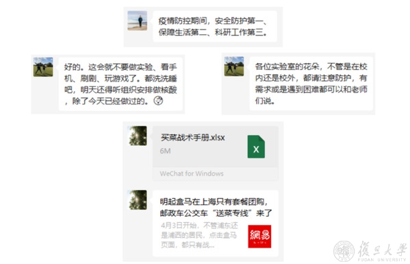 3月31日,浦西地区静态管理前夜,工程与应用技术研究院教师党支部副书记、青年研究员方虹斌向自己所带的硕士生和博士生挨个询问近况,关心大家的学业、生活和心理状况。