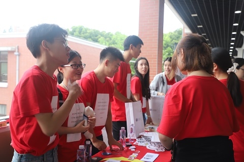 园区导引、答疑解惑、行李搬运……身着统一白色T恤的书院迎新志愿者早早地等候在报到现场,为学弟学妹们提供周到热情的服务。秉承“自我管理、自我服务、自我教育、自我监督”的教育理念,今年,五大书院的学生组织以五种主题颜色、书院Logo和不同书院的吉祥物为元素,精心设计了美观实用的书院生活介绍册、笔记本、扇子、钥匙扣等,制成书院专属的特色“大礼包”发放给每位新生,帮助复旦“萌新”们熟悉复旦文化,融入校园生活。