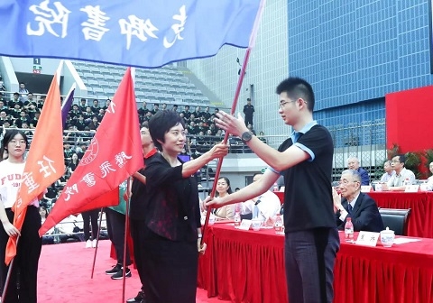 在庄严的升国旗、奏国歌仪式后,校党委书记焦扬为来自志德、腾飞、克卿、任重、希德五大书院的新生代表授书院旗。校长、中国科学院院士许宁生讲话。典礼由复旦大学常务副校长桂永浩主持。典礼前,许宁生会见了出席开学典礼的中学校长代表。