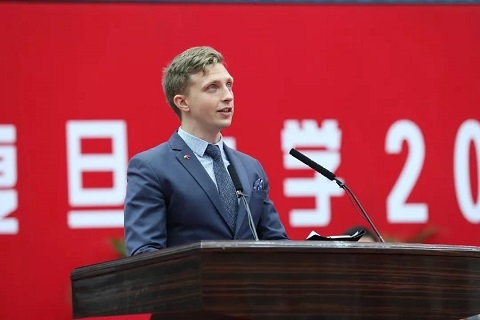 新闻学院2019级硕士研究生、来自波兰的严立行作为留学生代表发言。“中国在国际上扮演的角色越来越重要。” “只有接触才能感受,才能沟通,才能互动,才能建立情感。”严立行希望了解真实的中国,成为友谊的代言人。他表示,他将继续努力,提高自己,坚守复旦大学的校训“博学而笃志,切问而近思”,寻求真理、不畏艰难,为加强中国与各国的友谊发展做出力所能及的贡献。