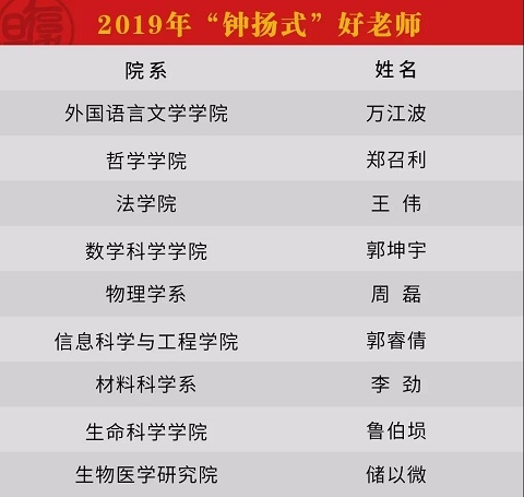 在新中国成立70周年、第35个教师节、全党深入开展“不忘初心、牢记使命”主题教育之际,学校党委决定授予万江波等9位同志“钟扬式”好老师称号;授予中国特色社会主义法治理念教学团队等5个团队“钟扬式”教学团队称号;授予杜威中心等5个团队“钟扬式”科研团队称号。