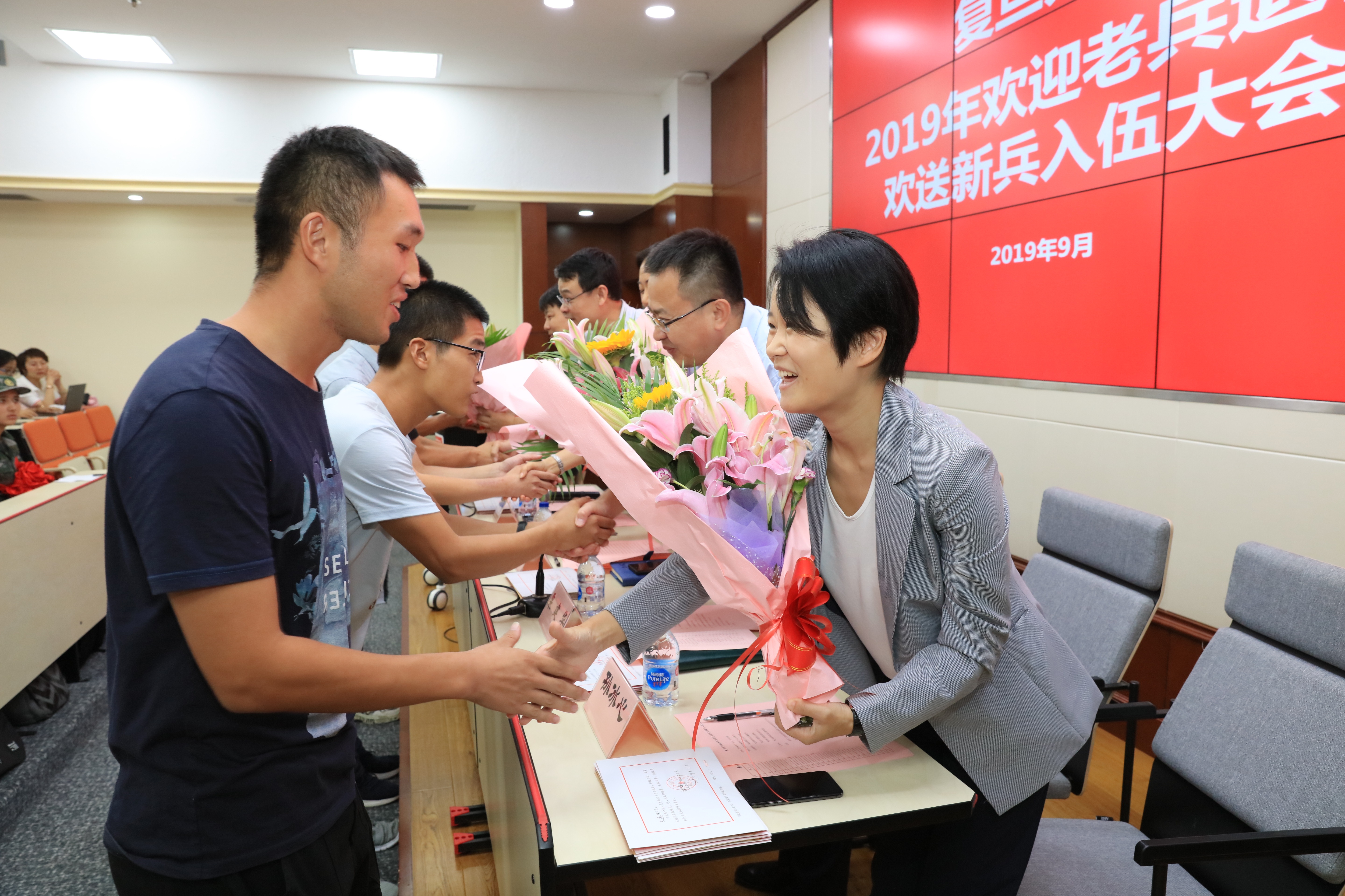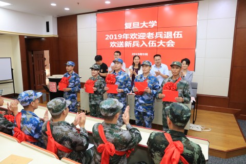 2019年9月18日下午,复旦大学2019年欢迎老兵退伍欢送新兵入伍大会在邯郸校区美研中心108室隆重举行。校党委副书记尹冬梅,武装部、学工部和研工部负责人出席大会,2019年退伍学生、入伍学生和部分院系学工负责人、辅导员等参加大会。