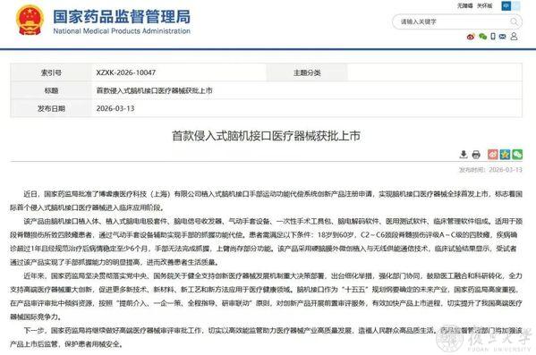 近日,国家药品监督管理局正式批准博睿康医疗科技(上海)有限公司植入式脑机接口手部运动功能代偿系统(NEO)创新产品注册申请。这是全球首个获批上市的植入式脑机接口三类医疗器械,标志着我国脑机接口技术逐步从实验室走向规模化临床应用,为全球神经疾病治疗提供了“上海方案”。