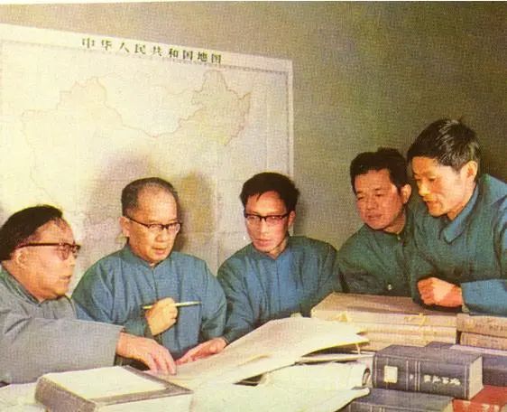 1970年代后期,谭其骧与同事研究《中国历史地图集》修订,自左向右分别是吴应寿、谭其骧、邹逸麟、王文楚、周维衍
