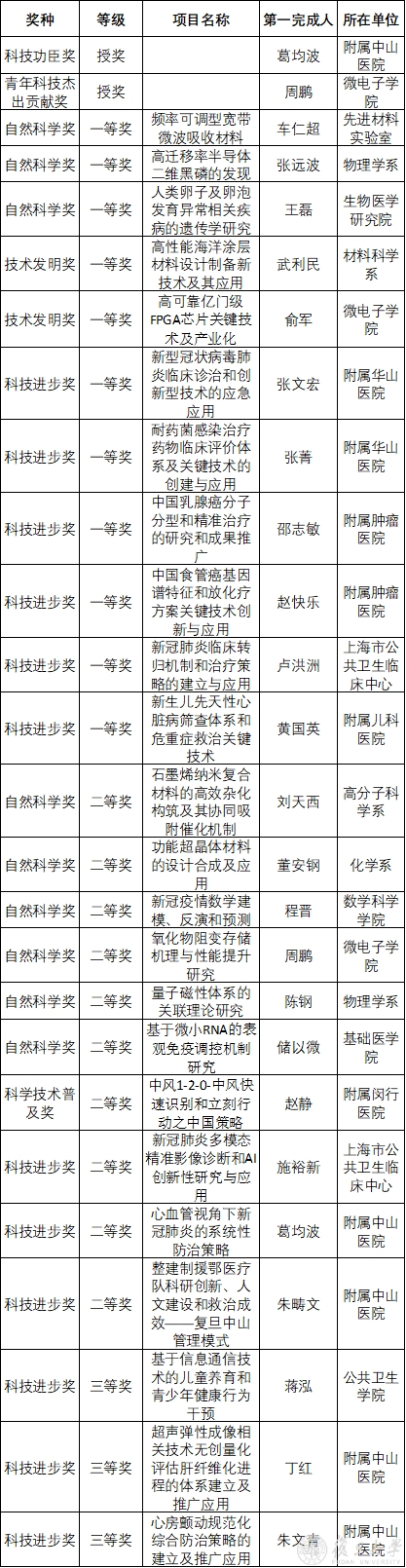 5月25日,2020年度上海市科学技术奖授奖决定发布,复旦大学在2020年度上海市科学技术奖评选中取得优异成绩,作为第一完成单位获奖26项(人)。其中科技功臣奖1人,为附属中山医院院士葛均波。青年科技杰出贡献奖1人,为微电子学院教授周鹏。一等奖11项,包括自然科学一等奖3项,技术发明一等奖2项,科技进步一等奖6项,一等奖总数创上海市奖历史新高。二等奖10项,三等奖3项。