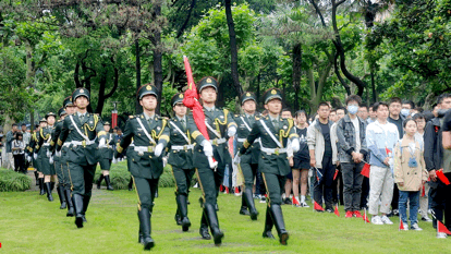 7时整,国旗护卫队在奏乐中护送着国旗进入会场;国歌响起,全体在场师生一齐向国旗致注目礼,庄严肃穆、敬意诚挚。