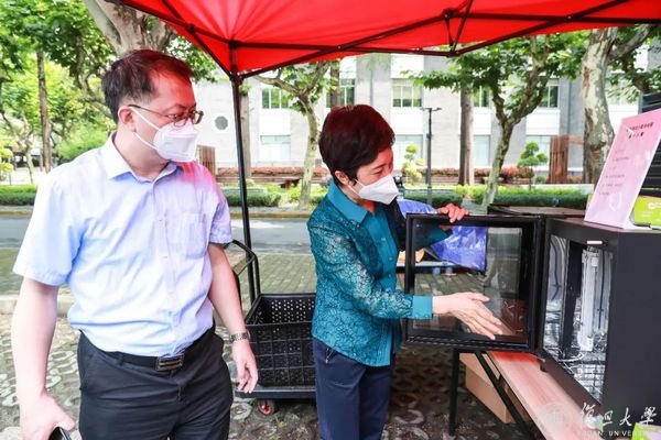 焦扬仔细询问场所码的应用情况和消杀箱的使用情况,详细了解了快递收发过程中的消杀流程。据悉,如今,各校区菜鸟驿站外均有明显的场所码标识,也都设立了快递消杀箱,配备消毒湿巾、洗手液等消毒物资,师生扫码入场,完成取件后可根据物品类型选择使用快递消杀箱或消毒湿巾对快递内包装进行消杀。